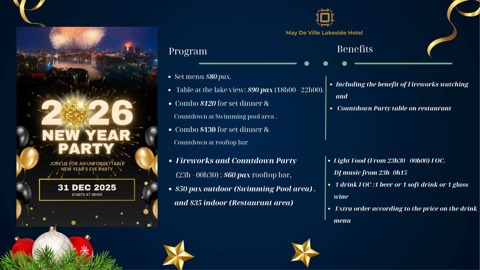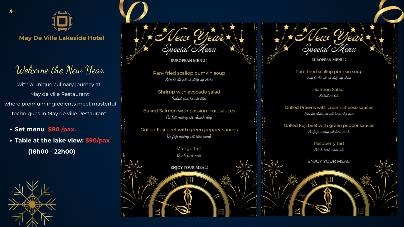 Experience the magic of Christmas in a fantastic location, May De Ville Lakeside Hotel ,where lively sounds and vibrant music create a festive atmosphere. With the perfect blend of holiday tunes and cheerful spirit, enjoy a special set menu designed to delight your taste buds as you celebrate both Christmas and the New Year. It’s the ideal place to gather with friends and family, share festive moments, and make unforgettable memories as we welcome the season of joy and new beginnings. May De Ville Lakeside Restaurant ( 12th floor ),The melodious sounds of the live music will transport you to a warm, sweet space alongside your loved ones